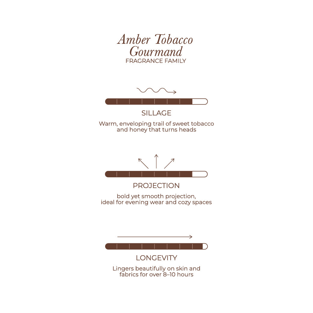 From its luminous, sweet-top notes to the deep, smoky heart, HONEY TABAC projects with authority and charm. Its trail is memorable yet inviting, leaving a lasting impression that draws people closer. Every element of HONEY TABAC is carefully balanced to create an enduring fragrance experience. Its warm, honeyed sweetness and elegant tobacco base combine to offer sophistication, intimacy, and an irresistible signature aura.